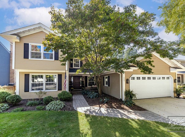 Stunning townhome, light and bright, three finished floors, impeccably maintained by its sole owner - this 2-bedroom, 2.5-bathroom townhome has everything! Gorgeous hardwood flooring throughout the main level, which boasts a large kitchen with stainless appliances and granite countertops with counter seating, walk-in pantry, spacious living room, powder room, and a formal dining space with access to the back patio through the large sliding doors. An open floorplan and picture windows flood the rooms with natural light. Neutral finishes throughout, including dark-stained stair rails with iron spindles to the second-floor loft space (potential third bedroom) and adjacent two bedrooms and two full bathrooms. The large primary bedroom features large windows, an ensuite full bath with double vanity, soaking tub and separate shower, and a well-organized walk-in closet. The fully finished basement features large space for entertaining, a home gym, entertainment or more, with ample storage space and is plumbed for an additional bathroom. Roof replaced in 2022. Furnace and AC replaced in 2025. Acclaimed D204 schools and close to highways, entertainment, and shopping!