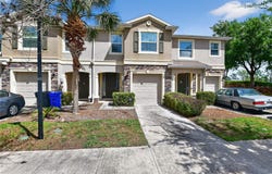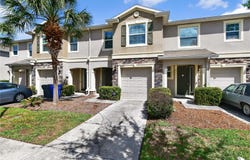 Beautiful end unit. Lots of windows on three sides. Light and bright. Looks brand new with fresh paint and all new flooring throughout home. Great floor plan with combined living and dining room that opens up to kitchen with breakfast bar and sliding glass door to back patio. Upstairs has a split bedroom floor plan with each bedroom having it's own full bath and walk-in closet. Washer and dryer closet is also upstairs. Community has a pool a short walk away and, also at 7461 Faulkenberg, just down the street, there is a neighborhood club house with work-out facility and large pool with splash area. All appliances stay including the washer and dryer. You also have two reserved parking spaces right in front of your home. HOA fees include water, sewer, trash and WIFI. Location is so convenient for Tampa and I-75. Call today to see your new home.
