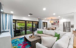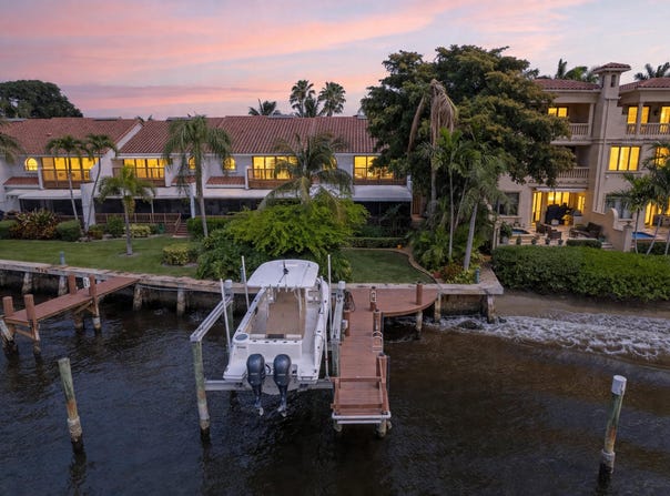 SPECTACULAR AND RARELY AVAILABLE WATERFRONT RESIDENCE nestled within the exclusive 12-unit boutique community of Ocean Cay. This exceptional corner, two-story condominium has been thoughtfully designed and fully renovated with impeccable craftsmanship and attention to detail throughout. Offering over 2,300 square feet of refined living space, this custom residence features 3 bedrooms, including a stunning first-floor primary suite, 3.5 beautifully appointed bathrooms, multiple private patios, impact windows, and a detached one-car garage. Privately tucked away in Ocean Ridge, this home showcases panoramic Intracoastal Waterway views and direct beach access just across the street. Impressive upon entry, the light-filled, multi-level floor plan seamlessly blends expansive living and dining areas, all framed by breathtaking water views from nearly every room. The gourmet kitchen is a true showpiece, featuring custom cabinetry, Quartz countertops, high-end GE Cafe appliances, a designer backsplash, and elegant gold finishes throughout. The generous first-floor primary suite offers wood flooring, designer wall coverings, an expanded walk-in closet with custom built-ins, and a private outdoor patio. The spa-inspired primary bath boasts custom cabinetry, an oversized dual-sink vanity, LED mirror, Quartz countertops, an elegant glass-tile accent wall, a freestanding soaking tub, and a frameless glass shower. A custom staircase leads to two private guest suites, each offering incredible water views and their own beautifully renovated en-suite bath. An adjoining bonus room provides flexible space ideal for a yoga or Zen studio, home office, or playroom. Step outside and enjoy your private waterfront oasis. Relax with morning coffee or sunset cocktails from your covered patio overlooking the Intracoastal. This upscale Ocean Ridge residence also offers a tranquil community pool with water views, dock rental availability exclusively for owners, and effortless coastal living. With countless upgrades and thoughtful details throughout, this exceptional home must be seen to be fully appreciated. From the moment you arrive, it is clear this rarely available residence is truly special-defined by breathtaking views, refined finishes, and an unparalleled lifestyle. Enjoy spectacular sunsets, nearby fine dining and shopping, and the very best of waterfront living. A beautiful lifestyle awaits.