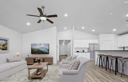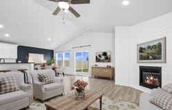 Discover the Hudson floor plan by Hayden Homes-a beautifully crafted single-level home offering 1,574 sq. ft. of functional and stylish living space. The heart of the home features an open-concept kitchen complete with sleek quartz countertops, ample cabinetry, and a convenient breakfast bar that seamlessly connects to the dining and living areas-perfect for both everyday living and entertaining guests. Enjoy the durability and modern appeal of luxury vinyl plank flooring throughout the main living areas, including the kitchen, dining space, bathrooms, and laundry room, making maintenance simple and stress-free. The primary suite is thoughtfully positioned for privacy and comfort, featuring a spacious walk-in closet, dual sinks, and a walk-in shower. Two additional bedrooms provide flexibility for guests, a home office, or a cozy den, complemented by a full secondary bathroom. Photos are similar and may reflect upgrades or variations.