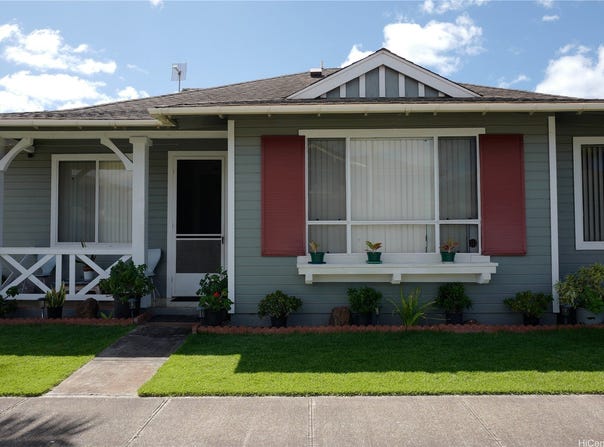 Welcome home to your beautifully-upgraded Makakilo Cliffs townhome! This desirable ground-floor 2-bedroom, 2-bath unit offers the perfect blend of style and convenience. Enjoy cool trade wind breezes, abundant natural light, and a relaxing ocean view from your private balcony! Inside, you'll find updated vinyl plank flooring throughout with ceramic tiles in the bathrooms! The upgraded kitchen features stainless steel appliances, and the renovated bathrooms include a full-size Washer and Dryer in-unit for added convenience! While this unit boasts excellent air-flow, there are box AC window units located throughout the home for added comfort year-round. This unit also includes two covered parking stalls, and it's conveniently located near schools, freeway access, and bus stops! At Makakilo Cliffs you are just minutes away from everything the second-city of Kapolei has to offer; including, but not limited to shopping, dining, and entertainment! Whether you're a first-time home buyer, downsizing, or investing -- this move-in ready home checks all the boxes! Call your favorite local Realtor to schedule a showing today!