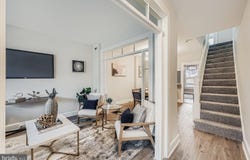 Experience the pinnacle of modern city living in this masterfully renovated 5-bedroom, 3.5-bathroom residence. Situated in the heart of Baltimore, this home seamlessly blends contemporary architectural elements with functional luxury, offering an expansive floor plan designed for both high-end entertaining and everyday comfort. Step through the entry into a light-filled, open-concept sanctuary defined by high ceilings and wide-plank flooring. The living salon serves as a stunning focal point, anchored by a floor-to-ceiling marble-clad fireplace flanked by contrasting charcoal accent walls. Above, a recessed tray ceiling with an integrated crystal chandelier adds an undeniable touch of grandeur. The transition to the dining area is marked by a bold, forest-green slat-wall installation, illuminated by a linear geometric chandelier-a true statement piece for formal gatherings. Designer Cabinetry , Crisp white Shaker-style cabinets accented by brushed gold hardware. Pristine white quartz countertops and a waterfall-edge breakfast island. A deep emerald subway tile backsplash and a matte black gooseneck faucet. A full suite of high-end stainless steel appliances, including a built-in microwave and French-door refrigerator. With five generously sized bedrooms, including a primary suite that acts as a private retreat, this home offers unparalleled versatility. Custom floor-to-ceiling tile work with intricate geometric and marble motifs. Matte black designer fixtures and circular vanity mirrors. Frameless glass showers and deep soaking tubs. Fully Finished Lower Level: Additional living space perfect for a media room, home gym, or guest suite. Dedicated Laundry room, featuring high-efficiency appliances. A classic Baltimore front porch and a rear deck, ideal for evening relaxation. All-new mechanicals, recessed LED lighting throughout, and premium finishes at every turn. 3023 W Garrison Ave is more than a home-it's a lifestyle statement. Schedule your private tour to experience this Baltimore gem in person.