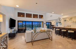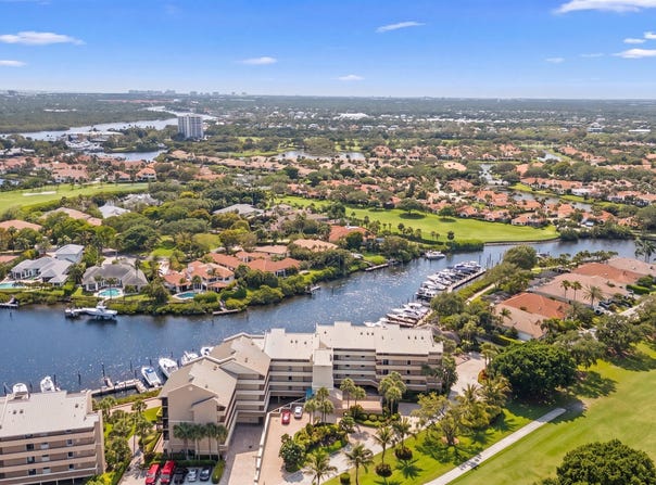 Stunning second-floor condo located in the highly desirable gated community of West Bay at Jonathan's Landing. This beautifully renovated and meticulously maintained residence features two spacious bedrooms plus a versatile den that can easily be converted into a third bedroom, along with two full bathrooms. The home showcases elegant wood-look vinyl flooring throughout, with a fully remodeled kitchen and bathrooms completed just 1.5 years ago. The kitchen is a chef's dream-from the custom cabinetry and striking Dolomite countertops to the touch-activated faucet and conveniently designed touch-open trash cabinet. It is also equipped with an induction stove and premium Cafe appliances. Thoughtful upgrades include custom molding throughout the home and plantation shutters on every window. The guest bathroom has been completely redesigned with raised ceilings, modern lighting, and dual sinks. Additional features include a full-size laundry room, an updated electrical panel (completed 1.5 years ago), and hardwired ceiling fans from Dan's Fan City. The enclosed patio, finished with hurricane-impact windows and electric blinds, provides valuable additional living space perfect for relaxing year-round. The home is fully protected with impact-resistant doors, windows, and garage door, offering both safety and peace of mind. A one-car garage plus a separate golf cart garage adds extra convenience. Ideally located just minutes from pristine beaches, theatre, parks, dining, shopping, and the airport, this exceptional condo blends luxury, comfort, and an unbeatable location in one of the area's most sought-after communities.